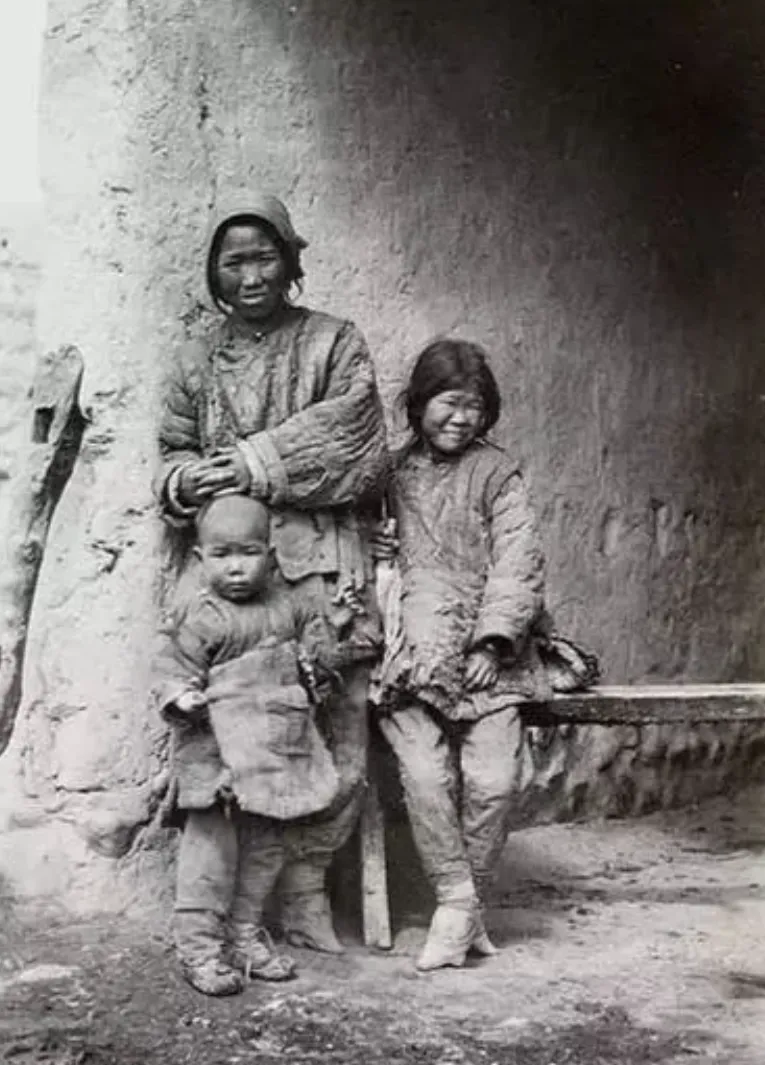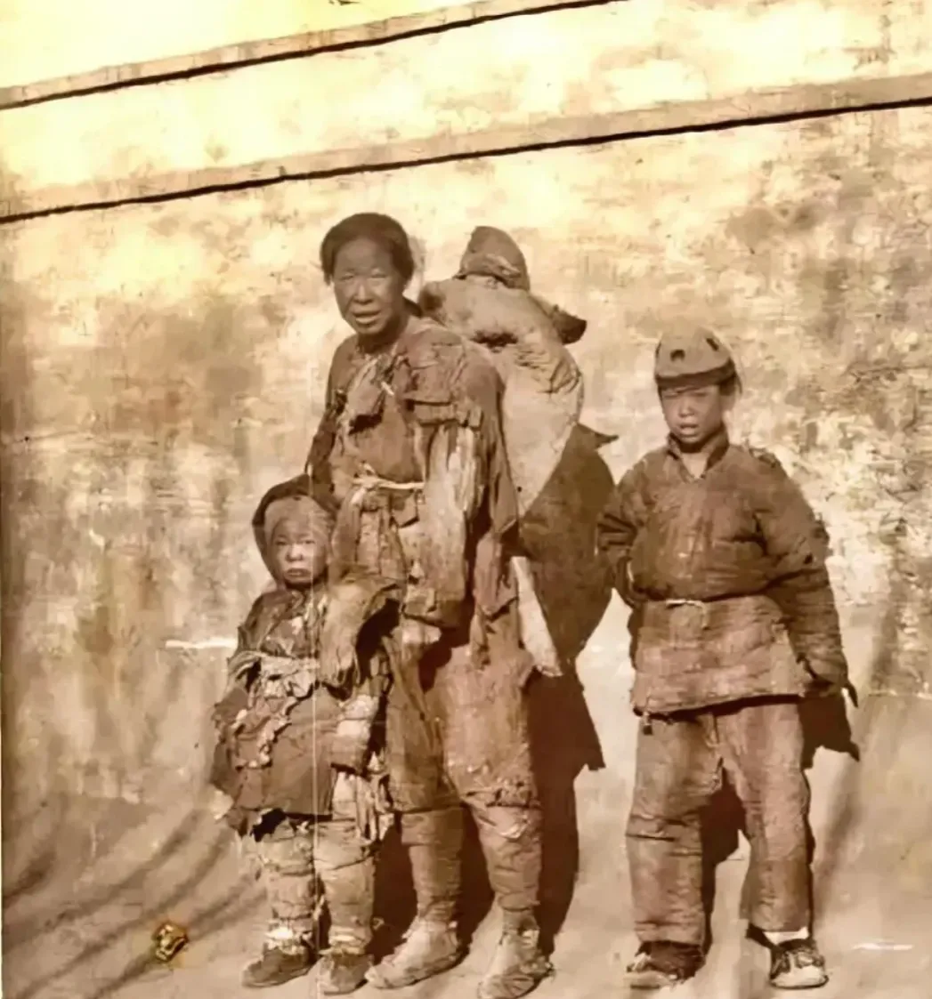 图中一家四口,身上的衣服补丁叠补丁,大人肩上背着小的,裤脚处破了又缝,鞋底能见出泥巴印子,小孩的脸全是风吹日晒的印记,那表情就像刚哭过又怕生,墙下站着,影子斜斜地拉在身后,谁家过年了,能吃上个鸡蛋都算有福气,日子没啥盼头,只能咬牙熬过去。
