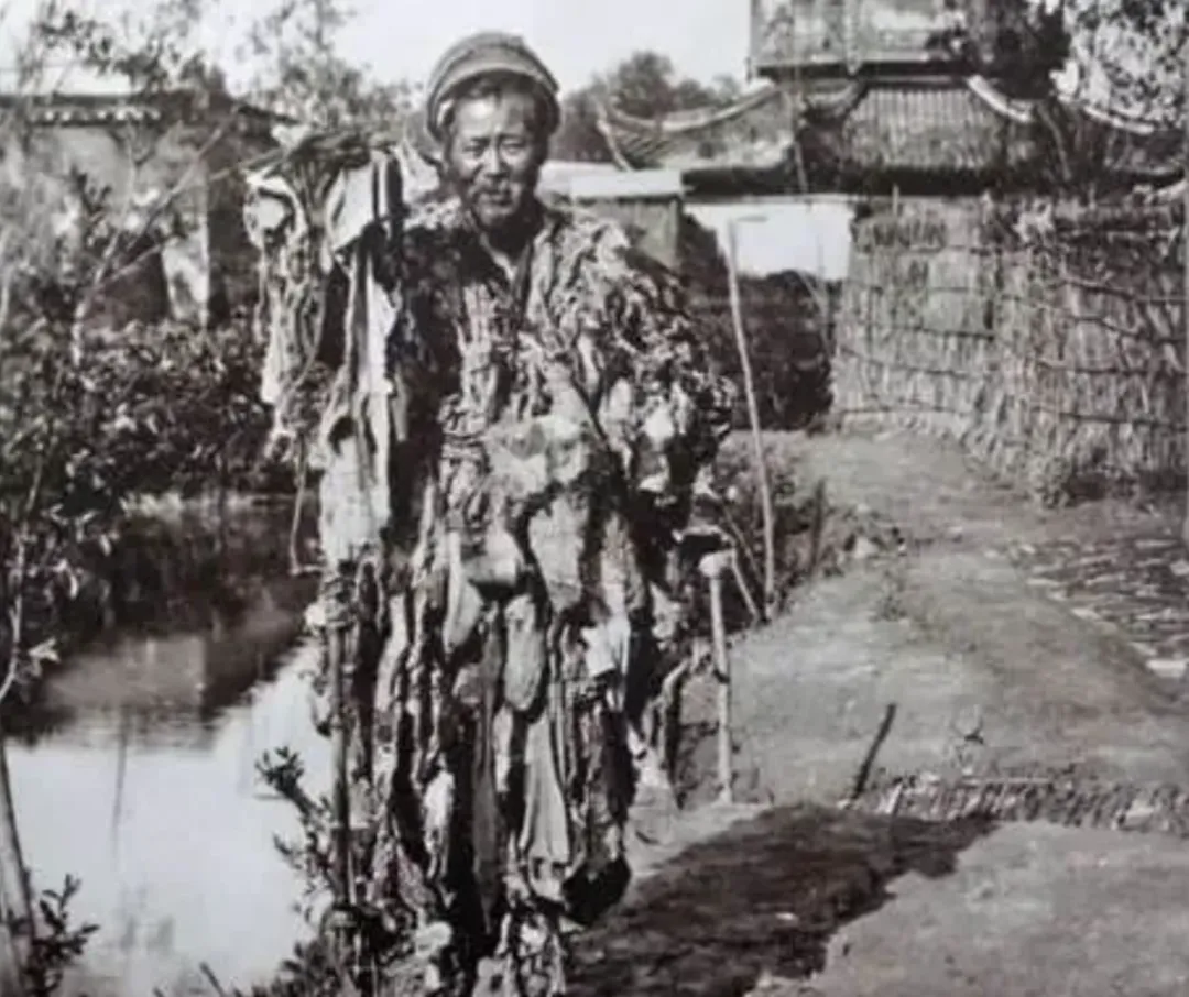 这个裹得像棉堆似的叫“讨饭佬”,全身上下看不出几处原色,破布头一层压一层,连个正经衣襟都没有,破棉絮和麻袋裹着防风,脑袋上搭着只旧碗作帽子,冬天冷成啥样他都得出门晃,哪家饭碗多给俩疙瘩头就能乐半天,衣服味道刺鼻,走近点都能闻出来。