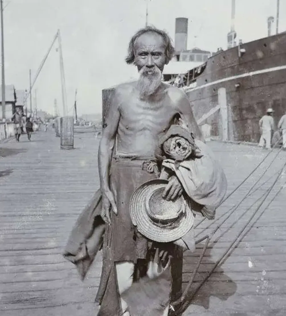 码头上这位,身上不剩几块衣布,全靠草帽和旧袍子遮太阳,瘦得肋骨一根根,好多人下码头干掉衣服,顶多留个裤衩防走光,最值钱的就是那卷成团的铺盖,白天扛包晚上找地儿打盹,奶奶小时候见过这些外地来的苦力,说“能活下来就算有能耐”。