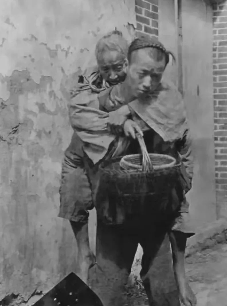 这个画面扎心,瘦得皮包骨头的老娘,靠着儿子背上的扁担,儿子低着头咬着牙,手还得抓着个破篮子,那会儿家家儿女都讲个“孝”字,可很多都是苦出来的,老娘上个街也难得有力气走,只能靠儿子一步步背起来。