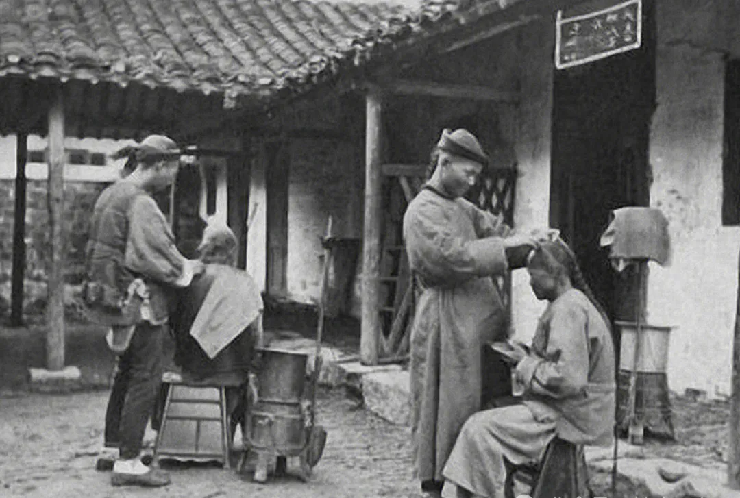 老房子的檐下,两个剃头匠蹲着给客户刮头发,靠着一只铜锅烧水,一边聊天一边挪手,补丁长衫、淡色的肩巾,街坊们都会坐下说会儿家常,剃头收的几个铜板得攒起来买油盐,剃一次能留香一天,后面站着的孩子瞅着大人怎么弄。