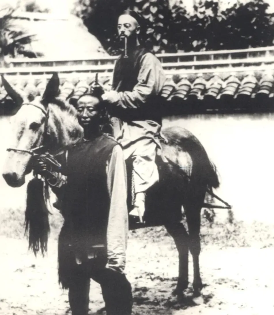 照片里一对主仆,前面牵马的汉子灰扑扑一身粗布衣,背后坐马的“爷”穿了细布长衫,这差距就印脑子里,牵马的脸上是没表情的苦,衣服松松垮垮,马走得慢,他的脚步跟得快,天热了路上尘土飞扬,没工夫擦汗。