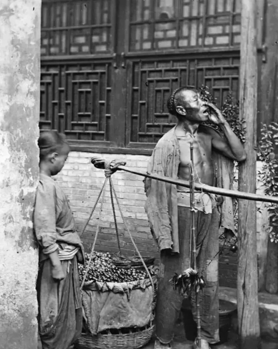 果子挑子一头沉,老汉额头油亮,张着嘴正吆喝“卖水果哇~”,肩膀晒得脱皮,手里抓着秤杆,身边的小孩瞪大眼看热闹,看一眼能记半辈子,这份辛劳和平常相比,谁也容易觉得自家稍微窘一会儿也不算啥。