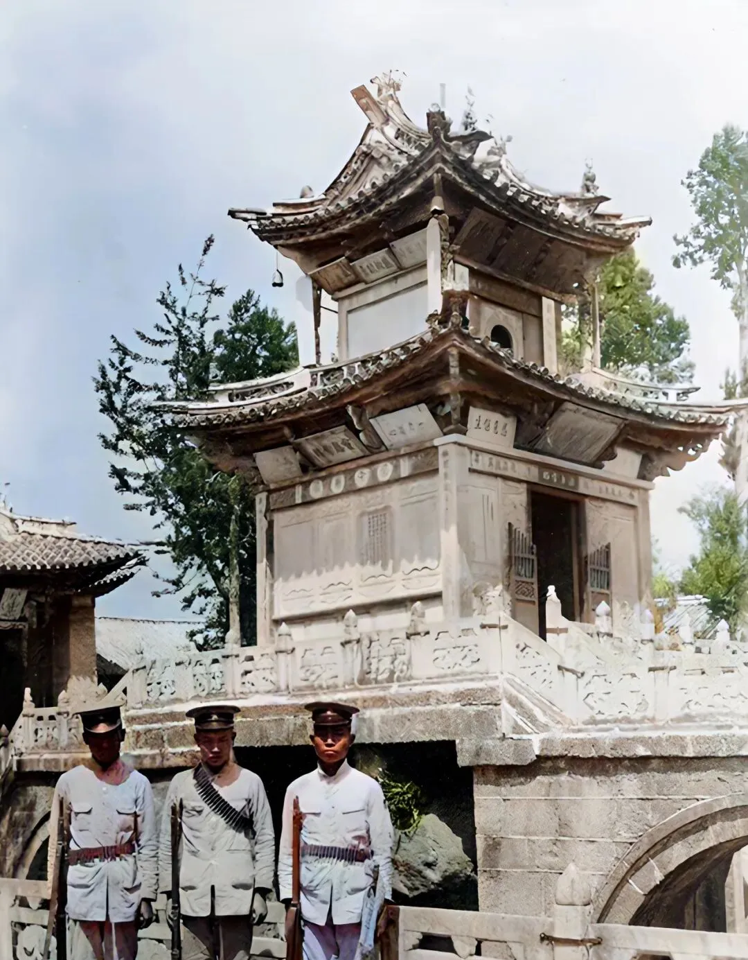 这个石栏杆绕着的楼叫观音阁,石雕边角软了,三名士兵站在桥上,草鞋绑着脚背,胸前挎着弹带,摆得正,像是护着一队商旅路过,老照片里这样的姿势不少,都是要让远方的人看见“我们在”,如今同样的位置,游客举着手机笑,石阶还是那几级,心里的事换了件外衣。