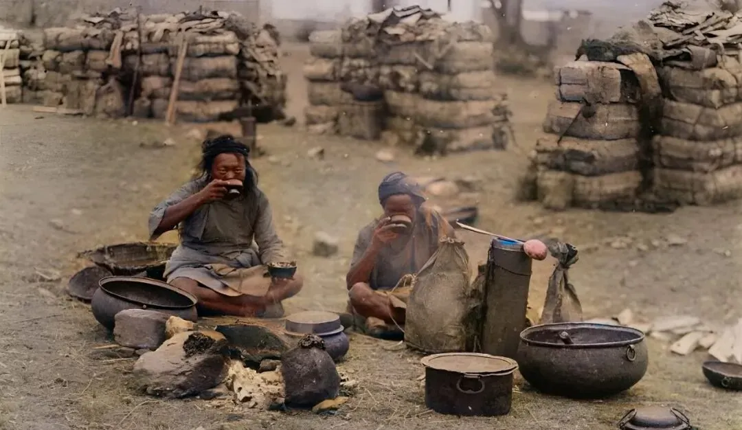 这张是马队歇脚,锅碗一字摊开,火头子用的牛粪饼围一圈,水开了就往碗里舀,茶砖削一角下去,喝起来自带土腥香,师傅们不吵也不急,咕嘟两口又要赶路,爸爸说“走到天擦黑,帐要结,人要睡”,如今物流车一晚跑几百里,灶火味道却再闻不着。