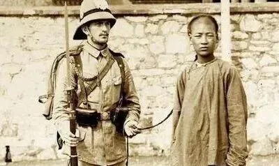 这张拍照的架势,一边是笑着神气的洋人,一边是脸部僵木的中国人,有些事搁现在都是屈辱,别说让人拽辫子,光是站在那,心里不是滋味。