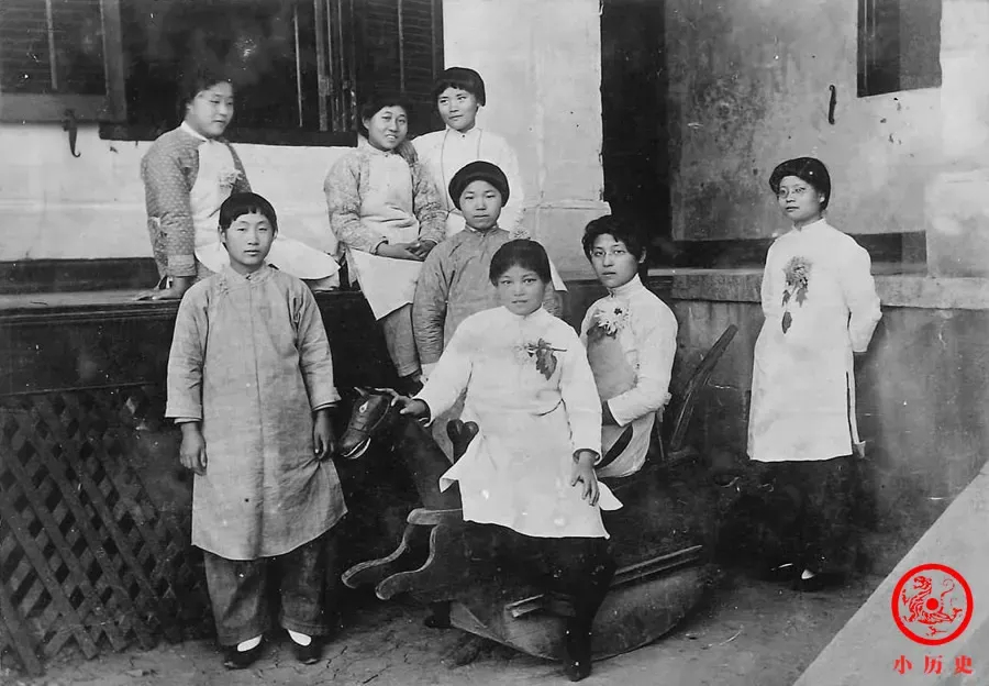 这8位女学生利用假期时间,参加社会服务,为64个邻居配送晚餐。她们身上透露出晚清新女性的气息,精神面貌也比较好。看她们的脚型,可能小时候裹过脚,后来接受新思想,又放足。