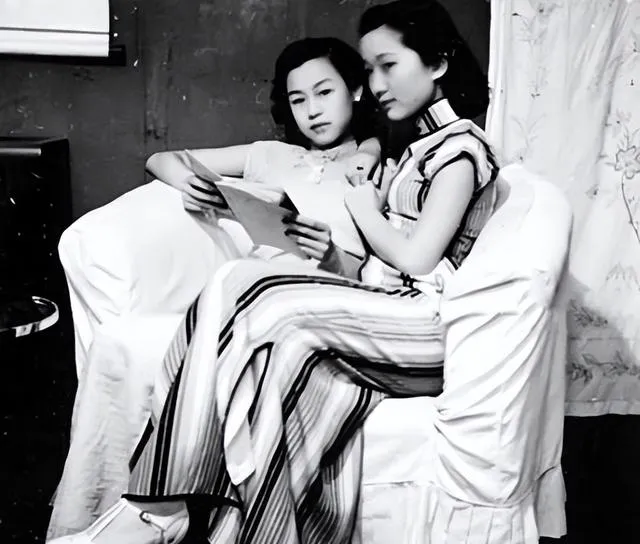 两个人挤在沙发上,这姿势要是没点闺蜜关系真整不出来,粗条纹旗袍配素色的绸布裙,手里一张纸,可能在看租来的画报,也有可能是学校发的印刷单,头发用铁夹卷过,额前的小卷扎在一起,带着点电影里女主的派头。