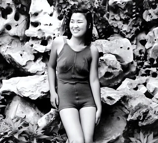 换一个场景,假山跟前站着姑娘,同样是泳装,这种连体式的只到大腿根,肩膀是宽带,颜色深一点,湿漉漉的布料贴着皮肤,头发散着毫无拘束,这照片要是现在发出来,评论区都能吵起来,其实那时候女孩们就是敢试新鲜,拍完照笑成这样,自信劲全写脸上了。