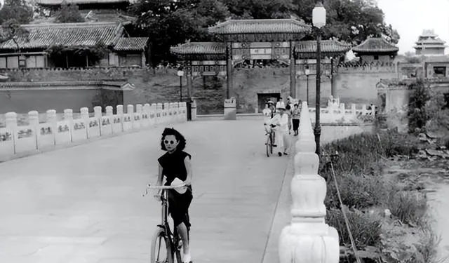 桥头骑车这一张气氛更松弛,巍峨的城墙、灰瓦的屋顶在远处,姑娘穿着黑旗袍,一路骑过去,身影猛地就比城市里的房子还鲜亮,前面有灯柱,有石栏,有大水面一圈衬着,姑娘骑得快,头发吹得都飞起来,身后有别的自行车轮廓,却都没她抓眼。
