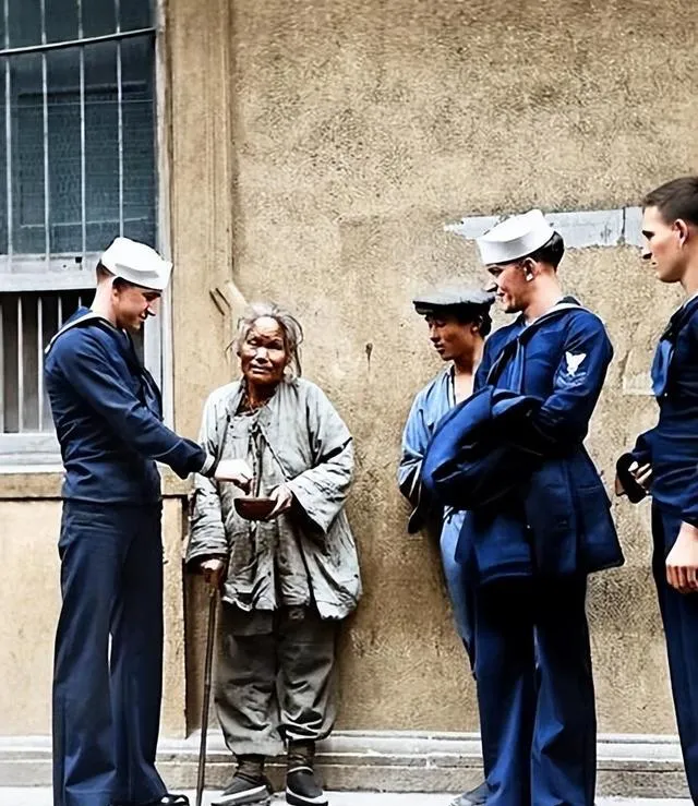 图里那排穿着笔挺(水兵服)的小伙子,是当年美国大兵,站在上海租界金角银边的地方,最左边的正伸手递钱给一位满头乱发的中国老人,这个老人衣服洗得发白,袖口补丁叠着补丁,破碗里捧着点零钱,拐杖都磨起了老茧,背后墙面旧得能刮下渣来,这场面对着晚饭锅台看惯了大人物的祖母都摇头,说,人呐,有时候命就是能差成两道墙,租界那年头,外国人在这一亩三分地里说一不二,外人进来了是主,咱中国百姓反倒得讲究规矩,老一辈说过,租界里能不惹事就躲远一点,这一幕写尽了国人难时的低头和被动,谁都不愿回头提。