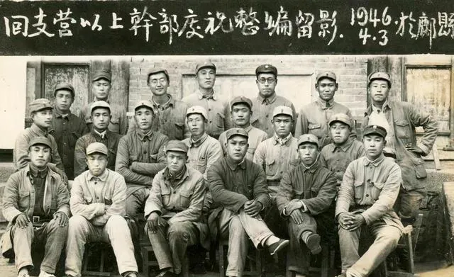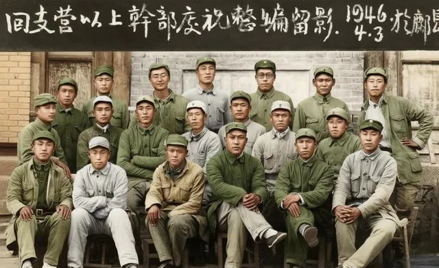 拍照片的这一大帮穿绿色军装、表情各异的,是1946年回民支队营级以上干部的合影,有人双手抱膝,有人胳膊交叉在胸前,身上的棉服没了铁锈、全是年复一年的洗涤,照片顶头那一行毛笔字写着“回支营以上干部庆祝整编留影”,老一辈常说,这支抗战队伍里最能打的就是这些身板结实、吃苦不喊疼的回族兵,马本斋的名字家里老人随口就能背出来,这张合影是队伍整编自新、准备再拼一场的纪念,一群人凑在镜头下,背后的破墙、脸上的陈年战痕,这些都说明了一个词,叫历尽苦难依然昂头挺胸。