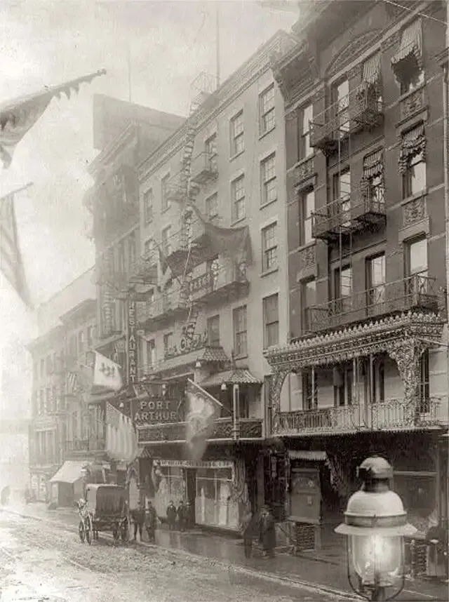 彼时的唐人街,是拥挤却充满烟火气的街区。砖石楼房外挂满了晾晒的衣物,铁艺阳台与消防梯交错纵横,中文招牌与英文店招并肩而立,既有「SING SING RESTAURANT」「PORT ARTHUR」这样面向西方的餐厅,也有藏在巷弄里的中式茶馆与杂货店,构成了东西文化碰撞的独特街景。