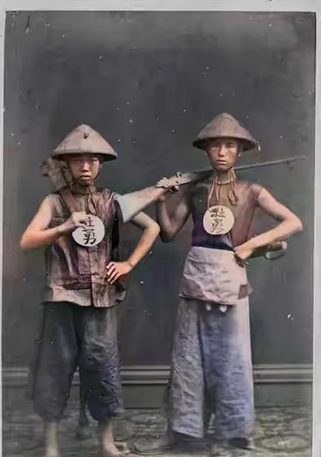 这俩穿粗布的汉子,胸前挂个圆牌子,写着“壮勇”,看名头挺唬人,站起来人却瘦得跟麻杆一样,手里摸着枪杆子,脚下还是打着补丁的鞋,真正的兵器就是一身胆子,爷爷看了咧嘴笑:“这种壮勇打起仗来,不给碗饭先就先晃菜”,其实他们靠得就是天天扛活,有时一天只吃一顿,还得跟着差事到处跑,真算不上什么铁汉。