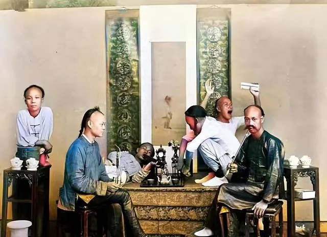 几个穿长衫的文人雅士围桌抽水烟,神态各异,这时烟比饭还金贵,桌上小茶盅摞着,谁吐槽谁家又出状元,谁讲上一句闲话就能逗乐半天,有的笑得前仰后合,有的抿嘴装正经,家里长辈以前也是这么过,一坐能坐晌午。