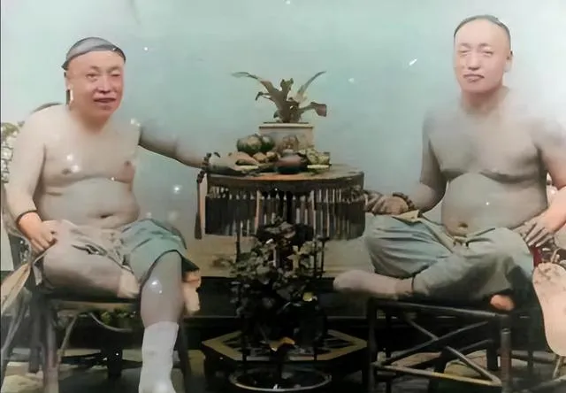 最后这张,两个人一桌茶,一个个胖得用不上衣裳,白肚皮外头还带着袜子,桌上摆着些家什,绿树掩映下,大热天就这样光着喝茶聊天,身上带着镯子圆环,爷爷笑过:“这不是富就是懒人”,说是玩笑,其实那就是生活的另一面。