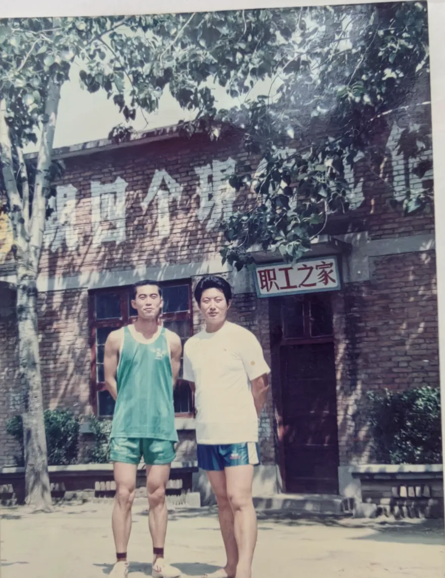 他俩背后这排红砖房就是修配厂食堂,墙上写着“为实现四个现代化而奋斗”。房前种着一排粗壮的杨树,每到夏天,这里绿荫一片。