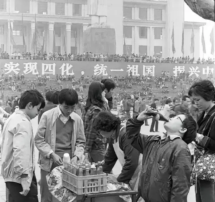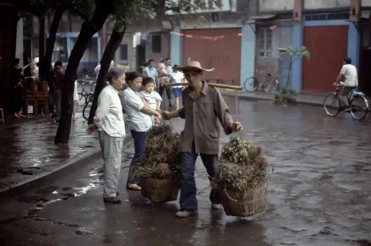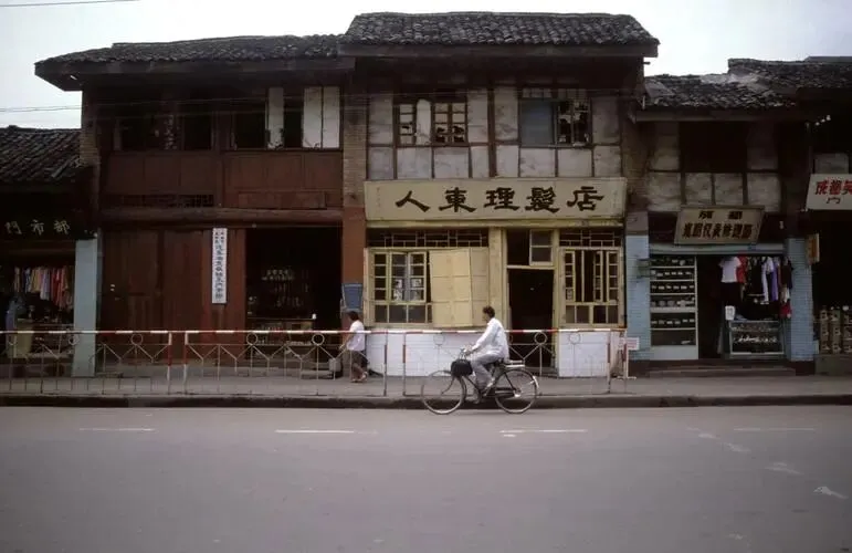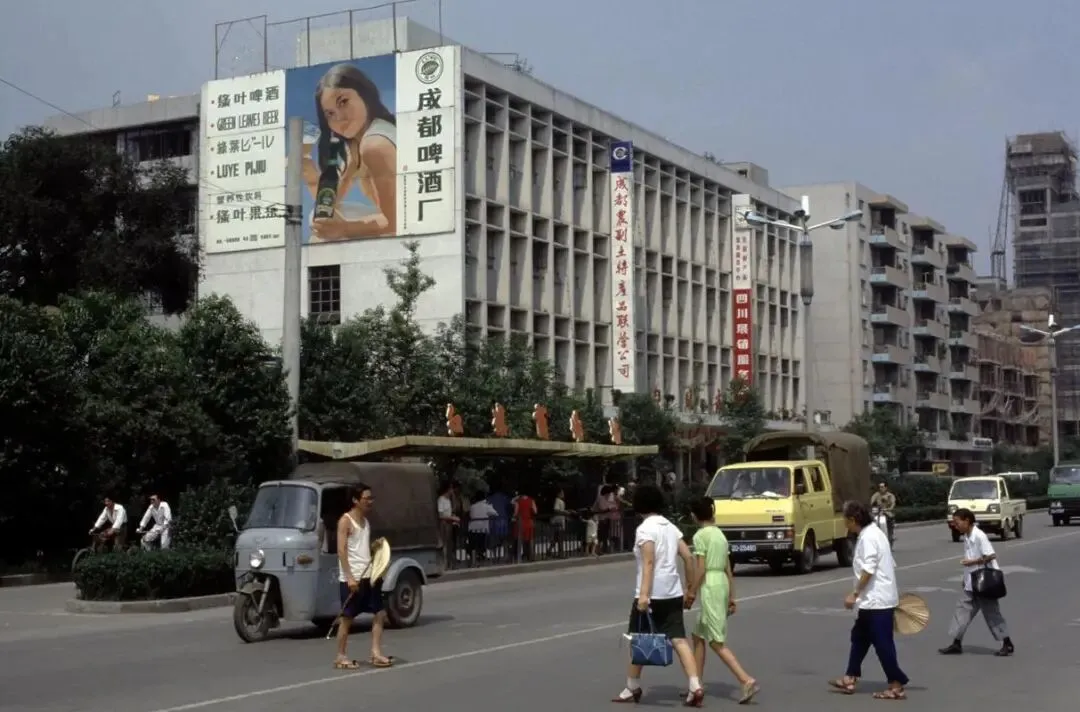 图一:80年代,成都一处街道随拍,照片中两个小学生下学后一边搂着肩一边吃着冰糕,远处墙上挂着要卖的贴画,这是当时很流行的时尚。图二:80年代,成都一处街道随拍,照片中几个妇女下班后在一家肉店挑选猪肉。图三:80年代,成都一处街道随拍,照片中是一个路口,一个农民戴着草帽,肩上挑着两筐野菜准备去集市售卖。图四:80年代,成都一条街道随拍,照片中一个打扮时尚的外国友人站在街边的体重计上称体重。图五:80年代,成都一处街道随拍,照片中一个人骑车28自行车路过一家理发店。图六:80年代,成都一所中学随拍,照片中学生们在围着一个卖冰棍、汽水的小摊,一个小学生正在喝汽水。图七:80年代,成都一处街道随拍,照片中一个农民正拉着一辆两轮小拉车,小拉车上装满了盛农副产品的箩筐。图八:80年代,成都一处街道随拍,照片中人们在用两轮小拉车拉着买来的煤炭。图九:80年代,成都一所妇产科医院门口随拍,当天下着小雨,医院大门上挂着计划生育的横幅。图十:80年代,成都一处街道随拍,照片中赫然挂着成都啤酒厂的宣传广告,当时正值夏季,街道上人们穿着夏装,简单,淳朴。 80 年代初,蓝、黑、灰三色仍是主流,中山装、解放装是很多人的日常,补丁裤子也不少见。但的确良衬衫已成为 “体面” 的代名词,挺括耐脏,是年轻人追求的时髦单品。男女多穿白衬衫配黑布长裤,整整洁洁。 清晨,清洁工扫街,人们骑车上班,早餐摊飘着热气;中午,街边快餐摊前排起队,端着饭盒吃饭的人谈笑风生;傍晚,菜市场热闹非凡,小贩吆喝,主妇买菜;夜晚,青年路夜市灯火亮起,年轻人穿着喇叭裤逛摊,收录机的歌声与小贩的叫卖声交织,构成最鲜活的成都记忆。 80 年代的成都,是慢节奏与新变革交织的川西市井长卷。没有如今的车水马龙,只有自行车洪流与市井烟火,老成都的韵味与改革开放的新风尚,在青石板与梧桐树下温柔碰撞。