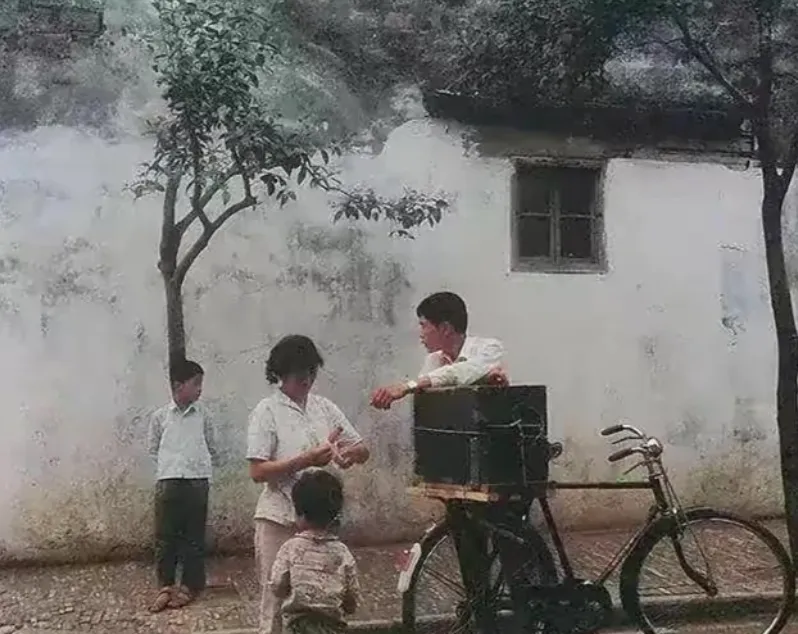 图上站在自行车边的这个就叫卖货郎,一辆老二八单车,后头还焊了个黑铁箱子,箱子边上绑皮带,里头啥都有,剪刀、咖喱面、扇子、肥皂、缝衣针,都是家家都用得着的东西,卖货郎一路骑一路吆喝,“剪刀——菜刀——换盆儿哎——”拖得老长,院里有需要的就赶紧出来招呼小时候逮着卖货郎,往往想拿鸡蛋换点小东西,想来想去又舍不得给,外头听那“叮铃铃”一响,就晓得**“主角来了”**,现在满大街快递外卖,自行车还真没这么能装的,原来谁家要补货,都靠这一嗓子。