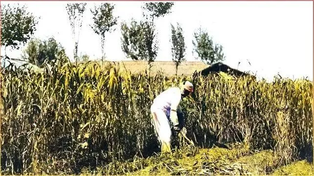 这位在高粱.地.里劳作的.农人,弯着腰,戴着草帽,专.注地收割着庄.稼.。那个年代的人们就是这样,.靠着双手.和汗水养活一家老小,日子虽苦却也踏.实。