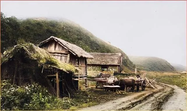 这.栋草顶.的老房子.,.墙体都长满了青.苔,牛车就停在门口,完完全全的.农家生活场景。现在别说见实物.了,连照片都很难找到了,.这就是真正的历史.记忆啊。