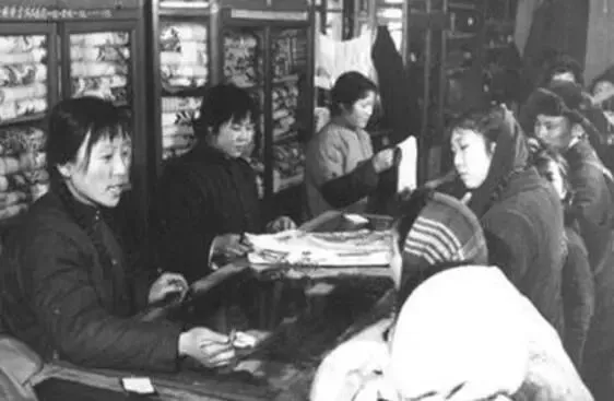 上世纪七八十年代的供销社里,女性们在布料银行柜台前购买布料。
