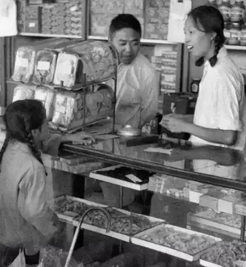 上世纪七八十年代的供销社里,一个小女孩在向营业员购物。