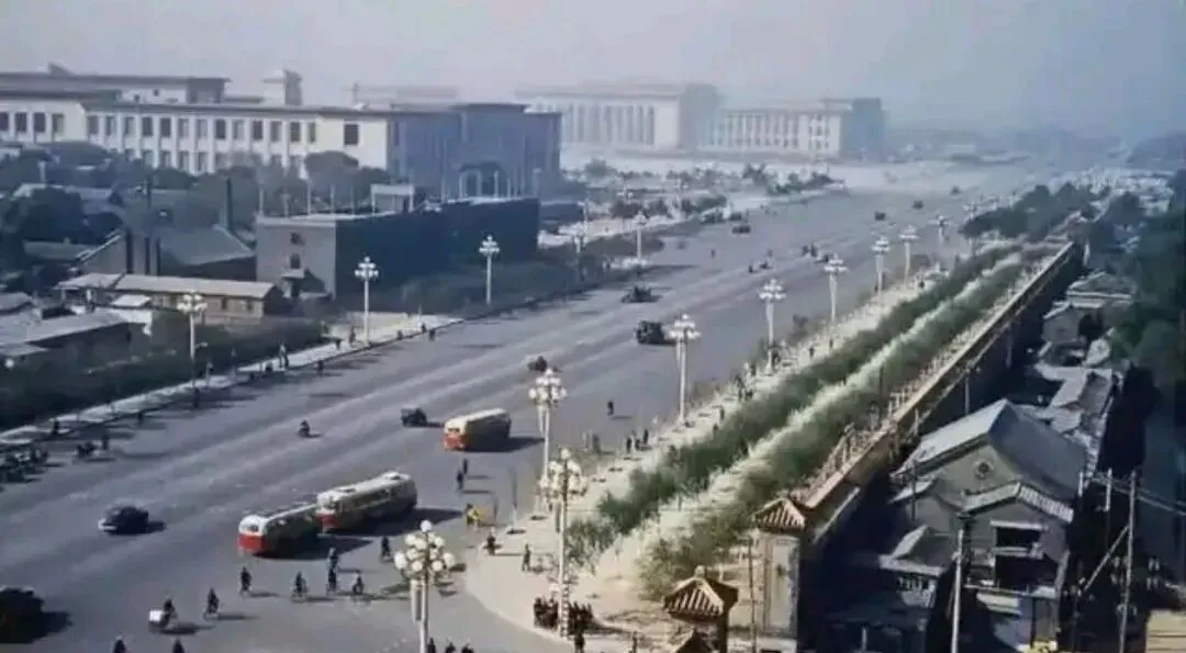 图中这条宽阔的大道是东长安街,右边那堵墙是北京内城南城墙,远处的大楼是人民大会堂和国家博物馆,当时叫中国革命历史博物馆,双向多车道铺得平整,华灯立在路边,无轨电车拖着长辫子往前走,公交车后头还挂着个小拖斗,那阵子为了迎接十周年国庆,长安街刚拓宽完,路面能跑得开,车也能错得过,站在街边往远处看,视野开阔得很,小时候听爷爷说他那会儿进城看热闹,头一回瞧见这么宽的马路,心里头就觉得这国家真是往前奔了。