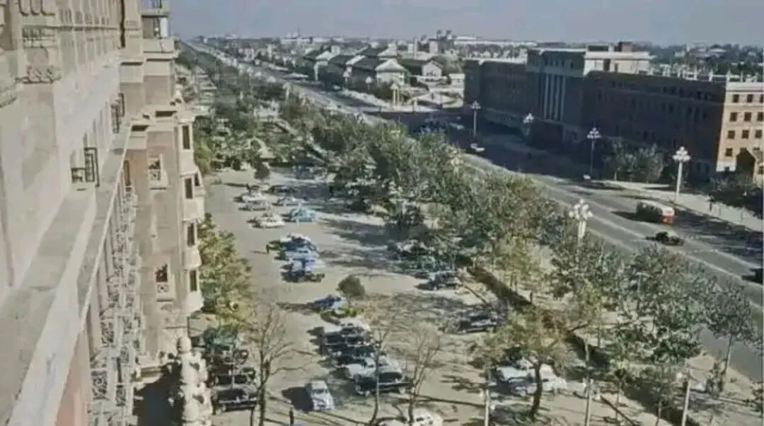 这张是从和平宾馆或者北京饭店往下拍的,左边是宾馆的楼体,右边是东长安街,远处能看见当时刚建好的"十大建筑",路面宽得像广场,车辆稀稀拉拉地跑着,路边栽的树还不太高,这个角度看过去,整条街都在眼皮子底下,1959年为了庆祝国庆,北京城里里外外都在忙活,街道改造、建筑翻新,照片里这些新式汽车和宽敞路面,就是那会儿的成果。