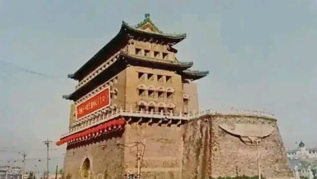 这条街是前门大街,有轨电车铛铛车正往前开,老式汽车、自行车混在一起,背景里的城楼是正阳门,楼上挂着庆祝国庆十周年的横幅,铛铛车的铃声在街上响得清脆,那会儿北京最繁华的地段就在这一带,店铺挨着店铺,人流不断,我爸说他小时候进城就爱坐铛铛车,车一晃悠,铃一响,感觉整个北京城都在脚下。