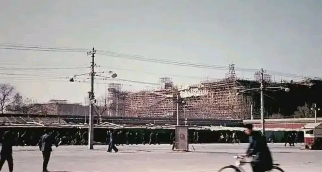 照片背景里那片施工场地就是正在建设的人民大会堂,外头搭着脚手架,广场上自行车和行人稀稀落落,人民大会堂是为了迎接新中国成立十周年专门盖的,1958年10月动工,1959年9月就竣工了,十个月建成这么大的工程,那会儿真是拼了命地往前赶,照片里脚手架还在,说明快完工了,站在广场上能看见一点一点起来的样子。