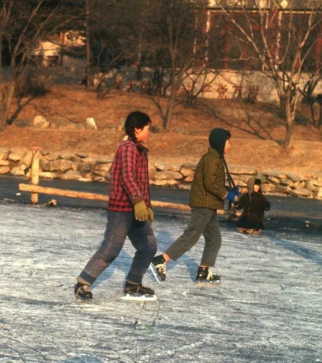 图里这俩小家伙脚底下踩的叫冰刀鞋,铁刃子绑在棉鞋底上,湖面冻得结结实实,一脚蹬出去能滑出老远,红格子棉袄穿得鼓鼓囊囊,手套也不知道掉哪儿去了,手冻得通红还舍不得回家,岸边有人喊"别滑远了",回头笑一下又接着玩,那会儿没暖气没羽绒服,靠着这股子野劲儿就把冬天过了。