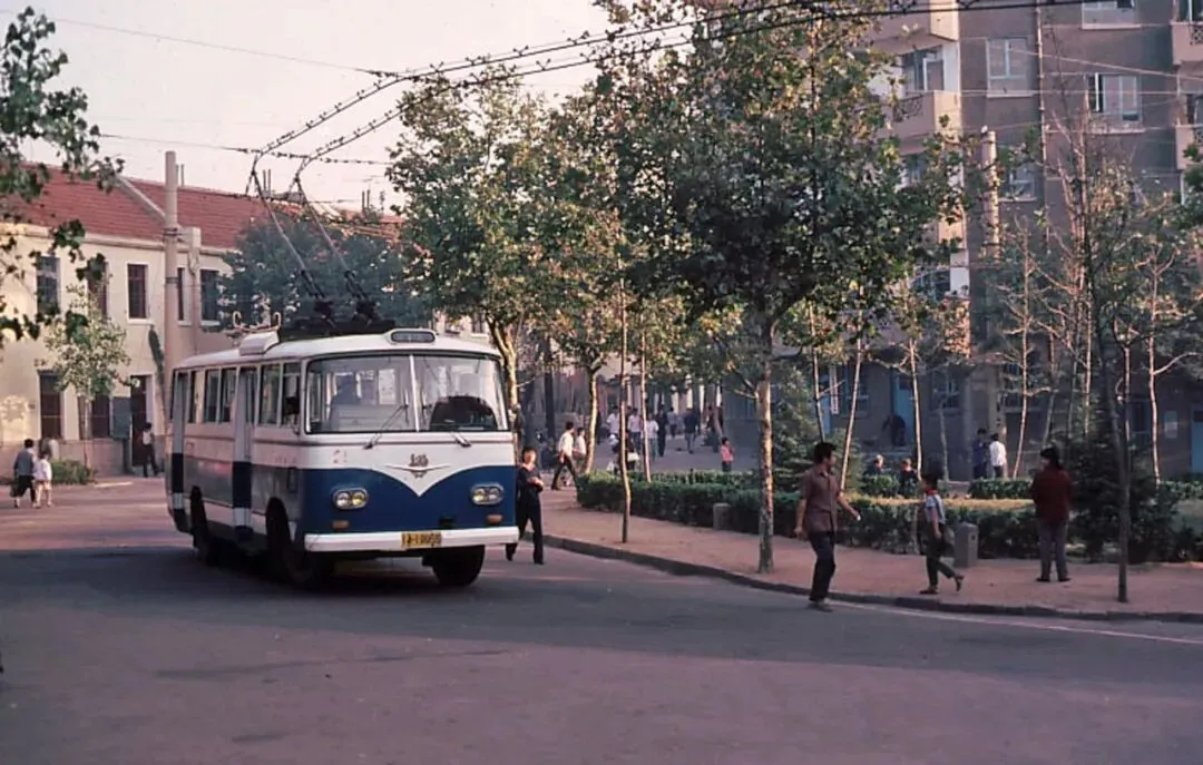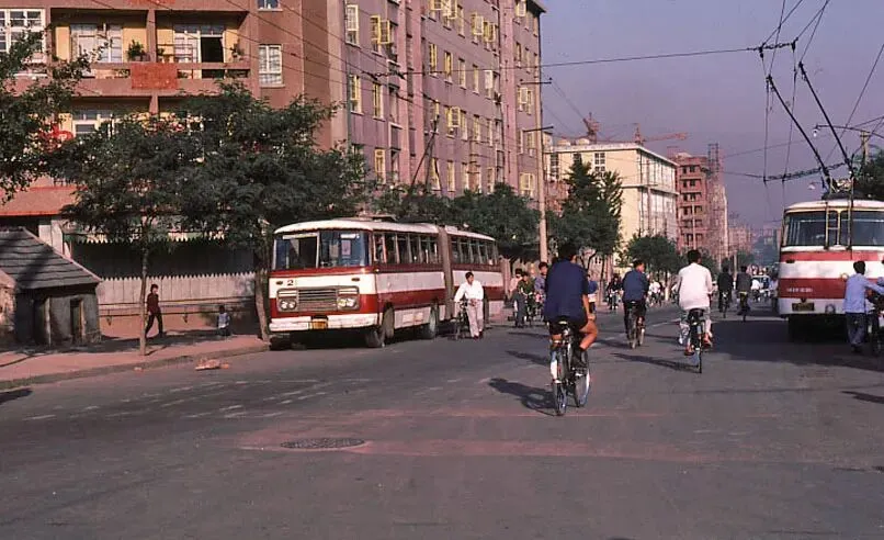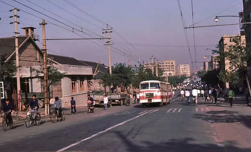 二八大杠自行车、公交车,路边停着的像是挂车斗子。