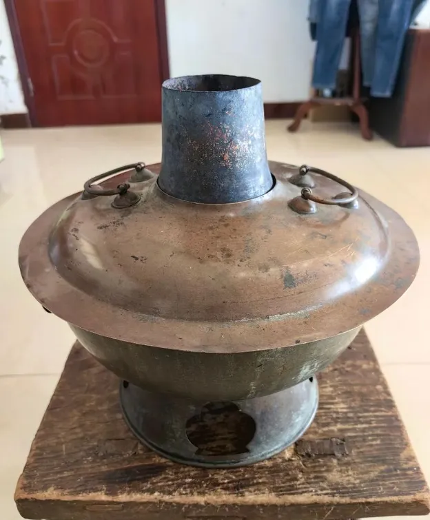 这件圆肚高盖的家伙叫铜火锅,冬天用它炖锅涮肉,那叫一个香,铜皮找得匀,边沿卷出一道亮棱,锅身被岁月燎得油亮乌黑,炉芯一掏,黄铜锃明,之前看过老北京人围着铜火锅吃羊肉片,一人一个小碗,蘸着麻酱,边聊边捞,锅盖一掀起热气腾腾的滋味,一下子就能驱散屋里的寒气,以前家家户户捏着几串铜钱买炭,如今高级餐馆才见得着,真有点物是人非的意思。