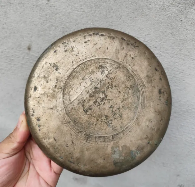 摊位角落圆形那只叫铜盆,敲敲碰碰多年,边沿凹进去一块,底色青灰里带点黑印,小时候拿它装热水泡脚,冬天睡觉前爸妈把盆搁炕头,水面还冒着热气,说一声“小心别烫着”,铜器导热快,水一晾干凉得也快,敲一下能听到闷声,夏天倒也能拿来淘米择菜,后来铝盆塑盆多了,老铜盆慢慢入库房,就成了一种念想。