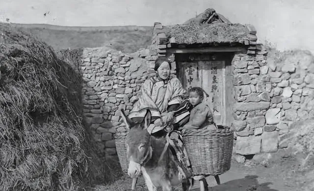 图中母女俩回娘家,妈妈骑着驴,女儿梳着辫子坐在竹篮里,能骑上驴已经算家底不薄,可后头那房子把底细全露了,石头垒的墙,茅草盖的顶,门框歪歪斜斜,驴多半是租的,走一趟得花不少钱,那年月能回趟娘家不容易,路远脚疼,租头驴省劲儿,可兜里银钱不够,心里就得掂量掂量。