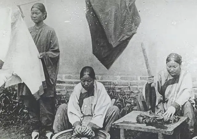 几个洗衣工蹲在地主家院子里干活,土豪们穿着绸缎过日子,这些粗活累活全是下人接着,天不亮就起,太阳落了还在搓,手上的茧子一层摞一层,为的就是能挣口饭吃,养家糊口,那时候没什么选择,命就是这么安排的。