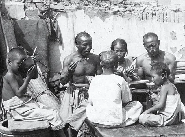 1900年,天津一户人家在院子里吃饭,桌上菜不多,就那么一盘,大家围着吃面,肚子还是饿,旁边小孩坐在水盆上,舔着碗底,那年月吃饱都难,更别说吃好。