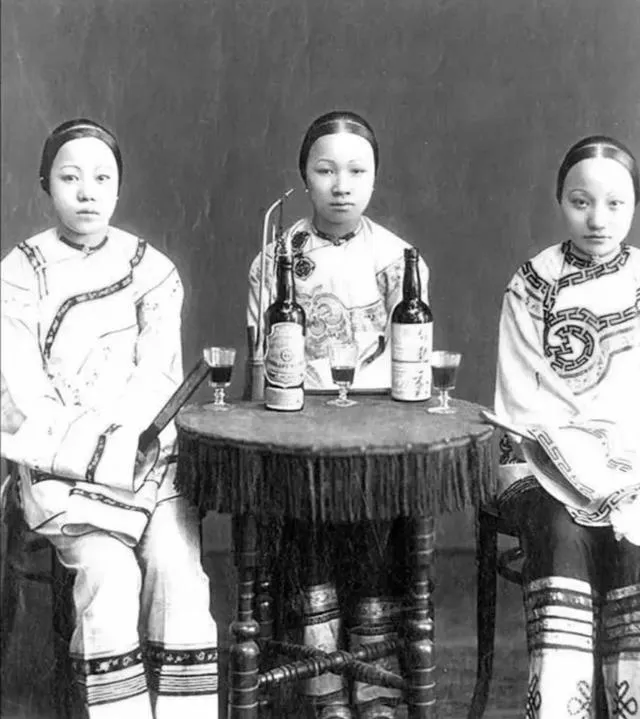 三个女人坐在桌前,桌上摆着红酒瓶子和酒杯,还有水烟袋,这排场搁现在都不常见,那会儿能天天喝酒的人家不多,价钱贵不说,还得讲究个时髦,这几位穿得体面,坐得端正,眼神里透着股子松快劲儿,有钱人的日子就是不一样。