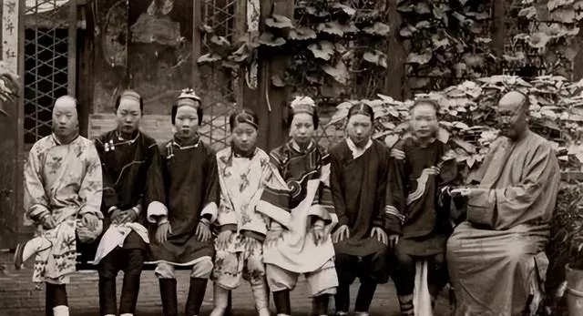 一名乡绅带着七个小妾站成一排,封建时代一夫多妻,正室讲究门当户对,小妾图的是年轻貌美,主子喜欢,可正室不待见,出身低贱,在家里抬不起头,左边那个姑娘双腿交叉站着,这姿势是那时候妓院里常见的,一看就知道来路不正,乡绅家大业大,养得起这么多人,可这些女人心里各有各的苦。