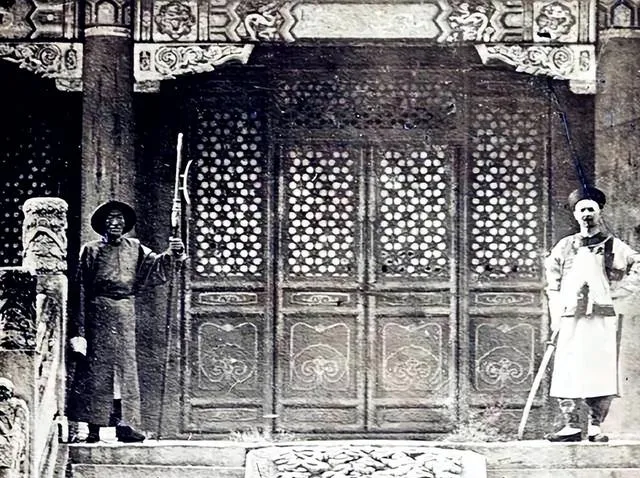 景山寿皇殿门口,两名御林军一个拿枪一个佩剑,站得笔直,这些人是千挑万选出来的,对朝廷忠心,可后来有了洋枪洋炮,这些冷兵器根本挡不住,外国人的炮火一轰,城墙都倒了。