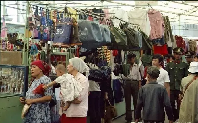 这个场景熟,不用多想就是小商品市场,天棚下挂着一排排包和衣服,摊主大姐嚷嚷的嗓门能盖过隔壁,头巾和白帽一眼望过十几个,边上站着几个军帽小伙,像是刚下班顺路逛,妈妈挽着儿子走进去,手里捏着零钱,怕丢了不敢松手,摊子边的人挤来挤去,大家伙追着流行的步子,可心里还是家里的老味道。