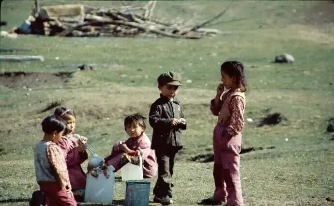 这地方不用问,肯定是在大草原上,孩子们坐一块,桶里装着水,其中一个端着铜壶,几个小伙伴围桌讨论怎么分,最小的那女孩肩膀上搭着毛巾,太阳一出来头发就闪亮,小时候哪有手机电视,野地里抓个小虫子能玩一天,走路带风,裤腿脏了没人管,草叶上带露水,一转眼红扑扑的脸蛋就晒黑了。