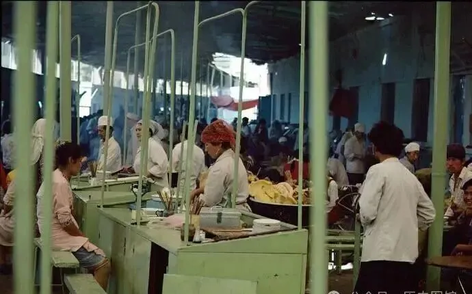 这里头人影重重,油锅冒着气,摊上一把小刀几盘馕,师傅忙得不可开交,这就是老乌鲁木齐的食堂市场,白帽子厨师排成一溜,边上坐着等吃的小姑娘把腰一扭,连吃饭都带着草原的热情,天棚下说笑声和锅铲声乱作一团,谁都不着急,大伙端上手的是热乎气,心里又踏实又满足。