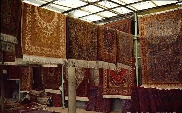 这地方一眼就认出来,是乌鲁木齐有名的地毯市场,红棕色大花一块挨一块地挂在横杆上,下面垫着新织完的地毯胚子,做工一看就扎实,边上的毛穗还透着羊膻味,那时候家有块好毯子是底气,有亲戚来家做客总要把最好的铺出来,炕桌一搭毯子一盖,屋里立马暖一半,奶奶说“好毯子能用好几年”,现在想想那会的富足就是这么传下来的。