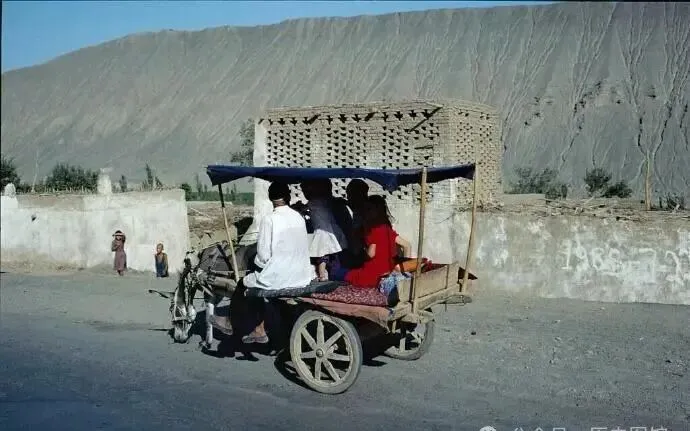 画面里这驴车咣当咣当地赶路,车上坐着一家子,顶着个棚,把人影都遮在阴凉下,后面的砖砌晾房一格一格,奶奶说那是晒葡萄干用的,山边风大又透气,满屋子甜香,家里小孩总馋得伸手想抓,一转眼晾房成了风景,驴车却越来越少,后来的孩子怕是只在照片里才见过。