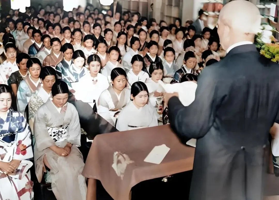 那张老照片上挤满了整整齐齐的身影,个个都是白色和淡雅花纹的和服,发髻扎得光亮,小脸绷着,不敢乱动,前排几位把双手轻轻放在膝盖上,背挺得笔直,后排的人往前探着头,好像怕错过什么,台上一个西装老头像是在嘱咐什么,桌上还摊着几张信纸。