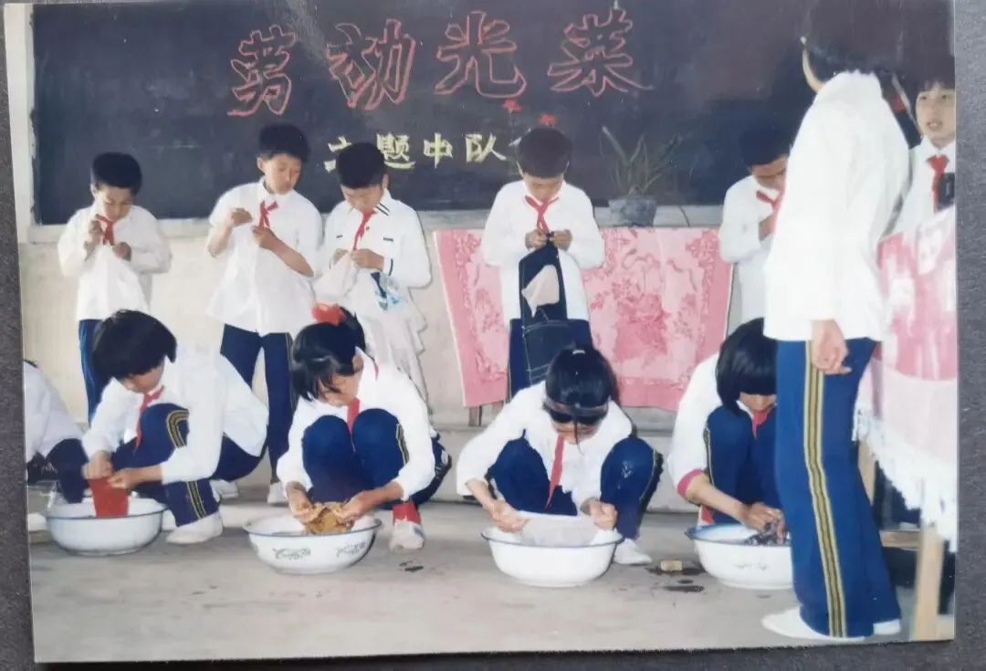 这张照片拍摄于1988年,记录的是东大小学某班正在举行的一次以“劳动光荣”为主题的中队会。