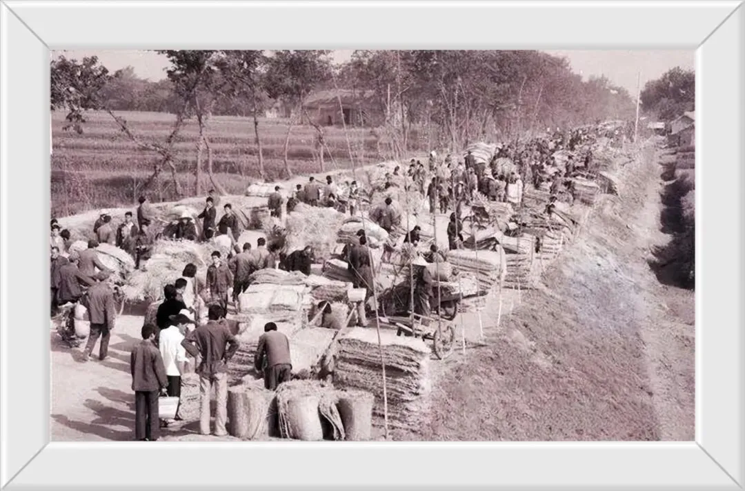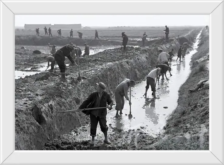 沙河铺七一公社的人在加宽渠道,挽着裤脚在泥水里忙碌着,为了庄稼有好的收成。