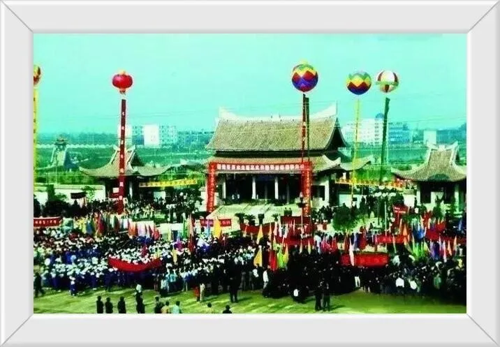 1998年秀水公园开园现场,彩旗队、锣鼓队整整齐齐,热热闹闹,八卦亭、飞虹桥,固始人爱逛。